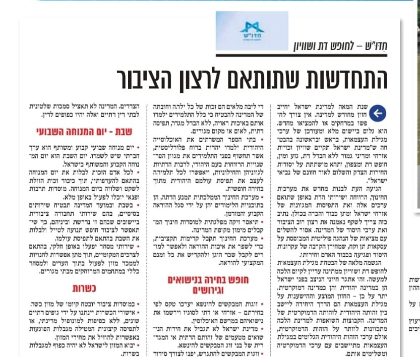 The time has come to rebuild the education, welfare, and religious services systems in a manner that aligns with these values and with the diverse perspectives of Israel's citizens, giving respect and recognition to all. Such a path must faithfully reflect the will of the majority of the public and the fundamental values of the state. We must reject political leadership that trades away core principles and undermines human liberty and dignity in backroom deals.